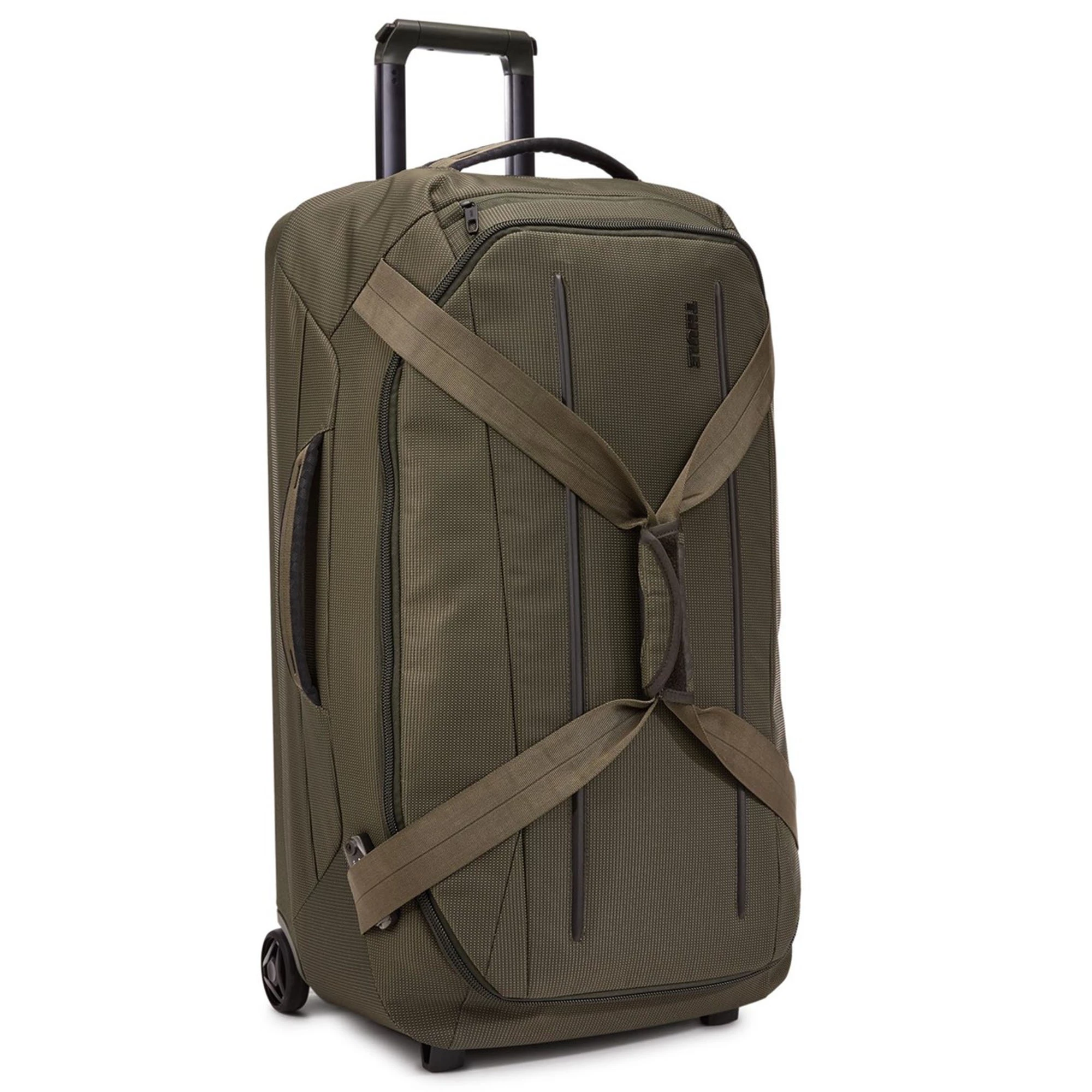 The Thule Crossover 2 Wheeled Duffle Bag is a durable and spacious rolling duffle ideal for longer trips. Your belongings are held securely in place with internal compression straps and the oversized exterior pocket allows you to easily access go-to items. Effortlessly navigate with oversized rear wheels that easily glide over any terrain and get exceptional stability and a smooth, steady pull from the patented V-tubing telescoping handle. Confidently maneuver your way through the airport with the Thule Crossover 2 Wheeled Duffle Bag.